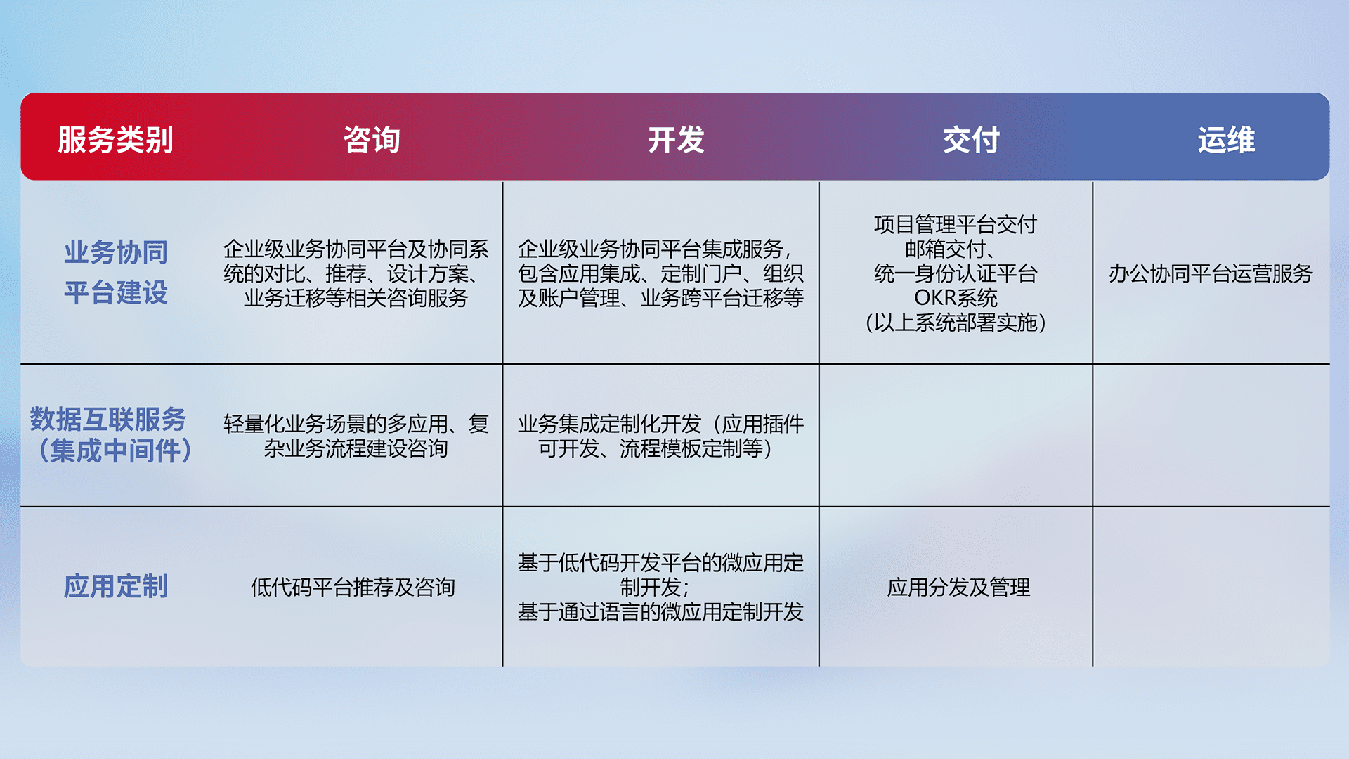 针对钉钉、、、、企微、、、、IDaas等平台级产品提供产品的规划、、、方案、、交付、、、定制化开发等服务,,实现如统一协同办公、、、、智能客户服务、、混合会议管理、、、、智能数据查询、、、、等业务场景,,,,实现数字化转型。。
